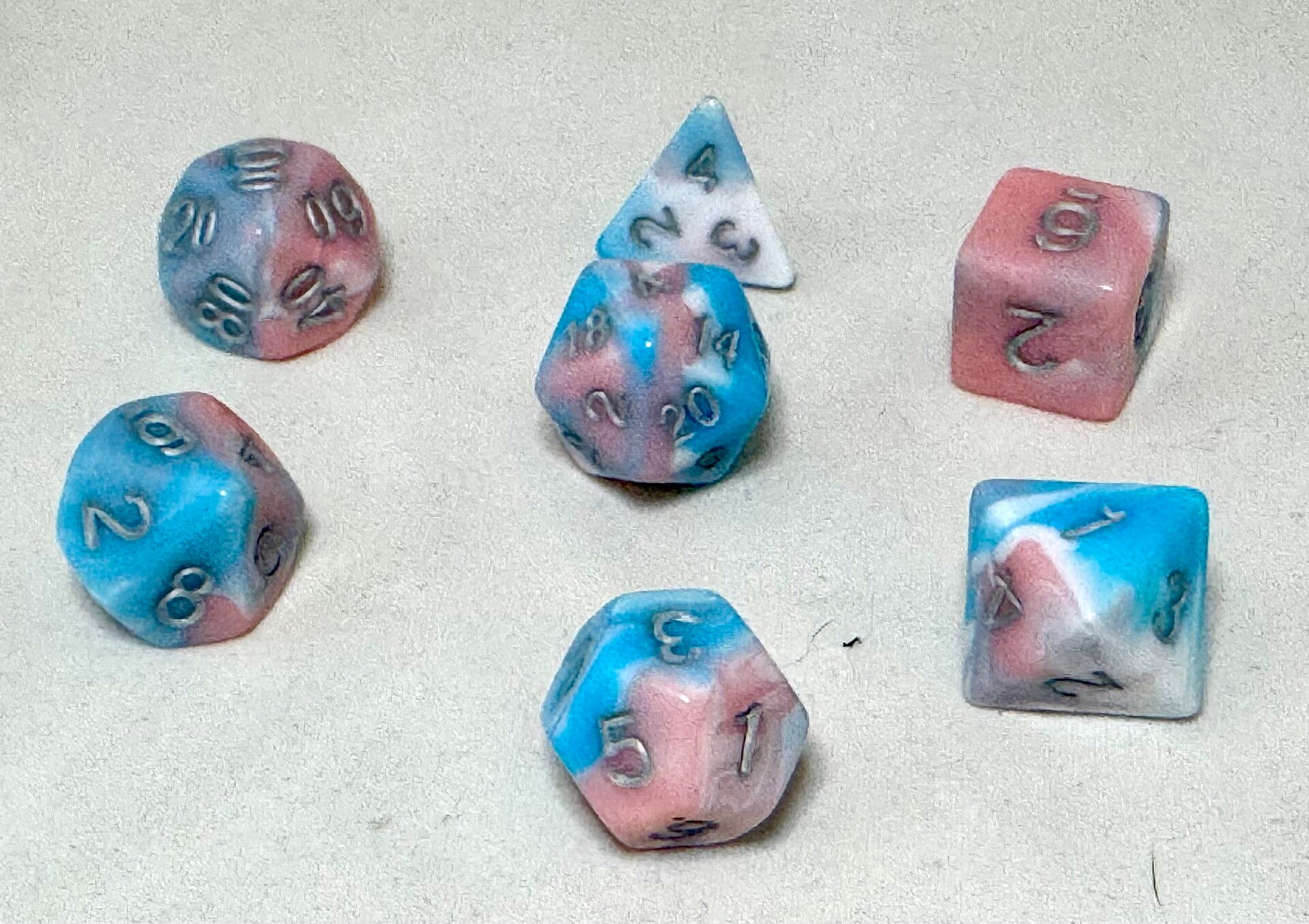 Set composto da sette dadi poliedrici in materiale acrilico con spigoli smussati. Bicolori miscelati con effetto marmoreo, i numeri possiedono una font ad alta leggibilità e sono bianchi per risaltare meglio.Sono presenti i dadi: D4,D6, D8, D10, D12, D20, D%.