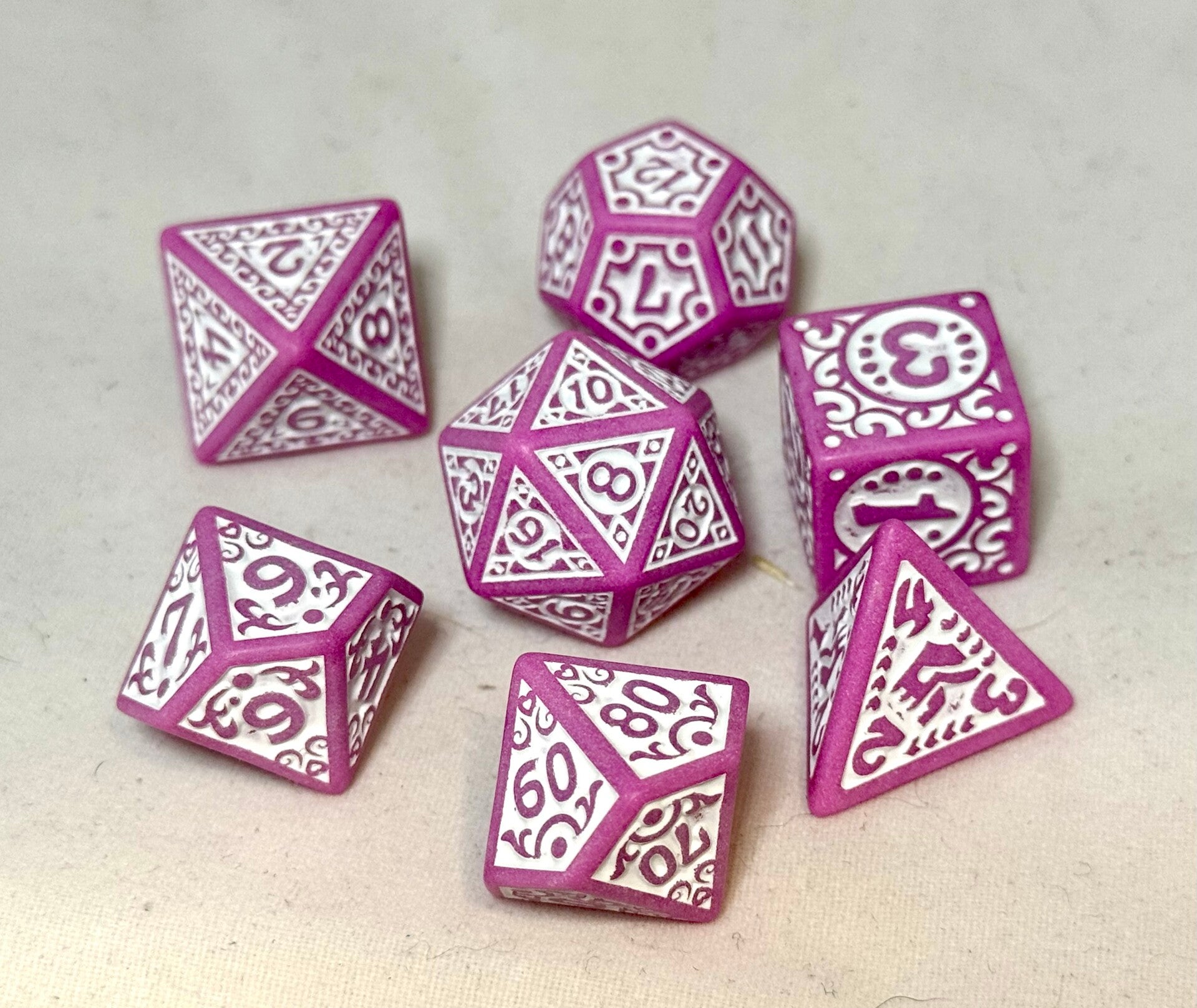 Set composto da sette dadi poliedrici in materiale acrilico con spigoli smussati, decorazioni stile vintage, effetto opaco.Sono presenti i dadi: D4,D6, D8, D10, D12, D20, D%.