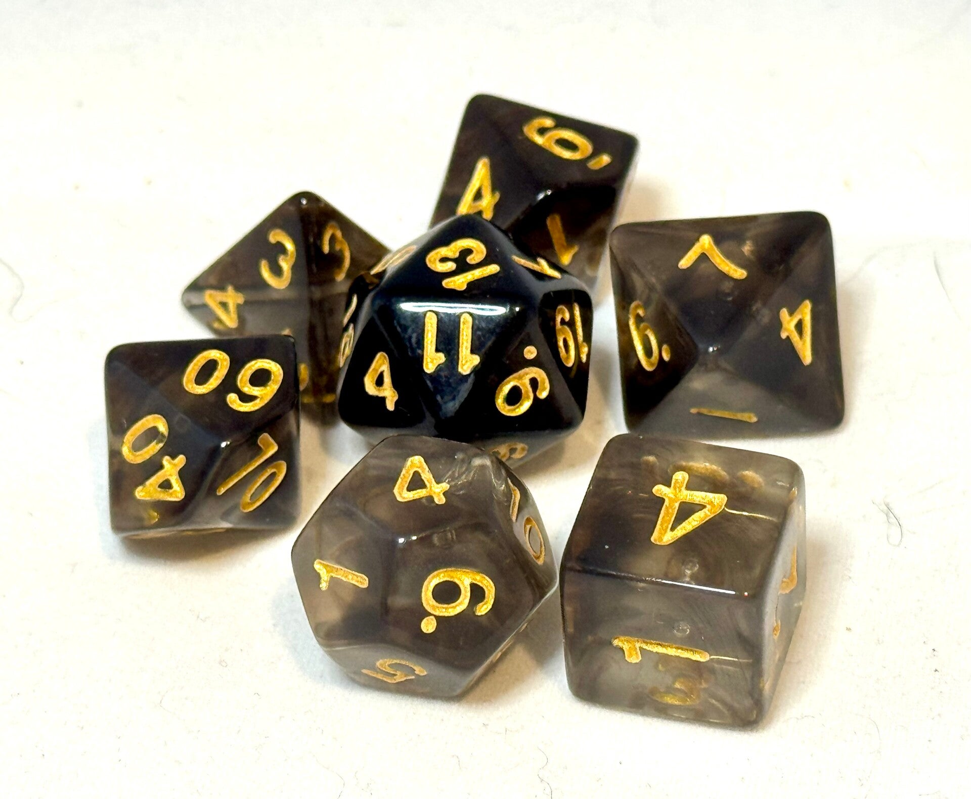Set composto da sette dadi poliedrici in materiale acrilico con spigoli smussati. Colorazione particolarissima: fumè. Sono presenti i dadi: D4,D6, D8, D10, D12, D20, D%.
