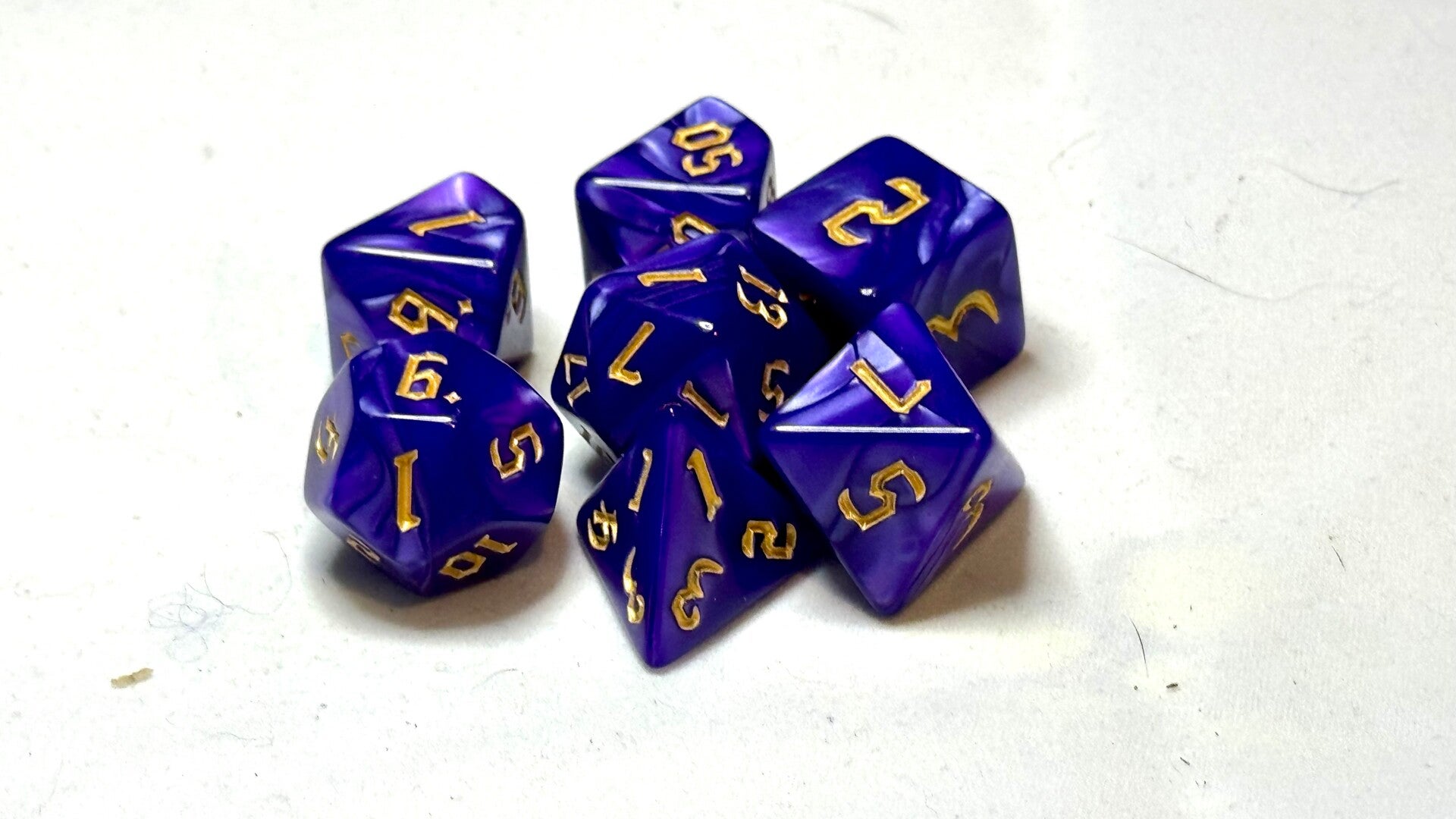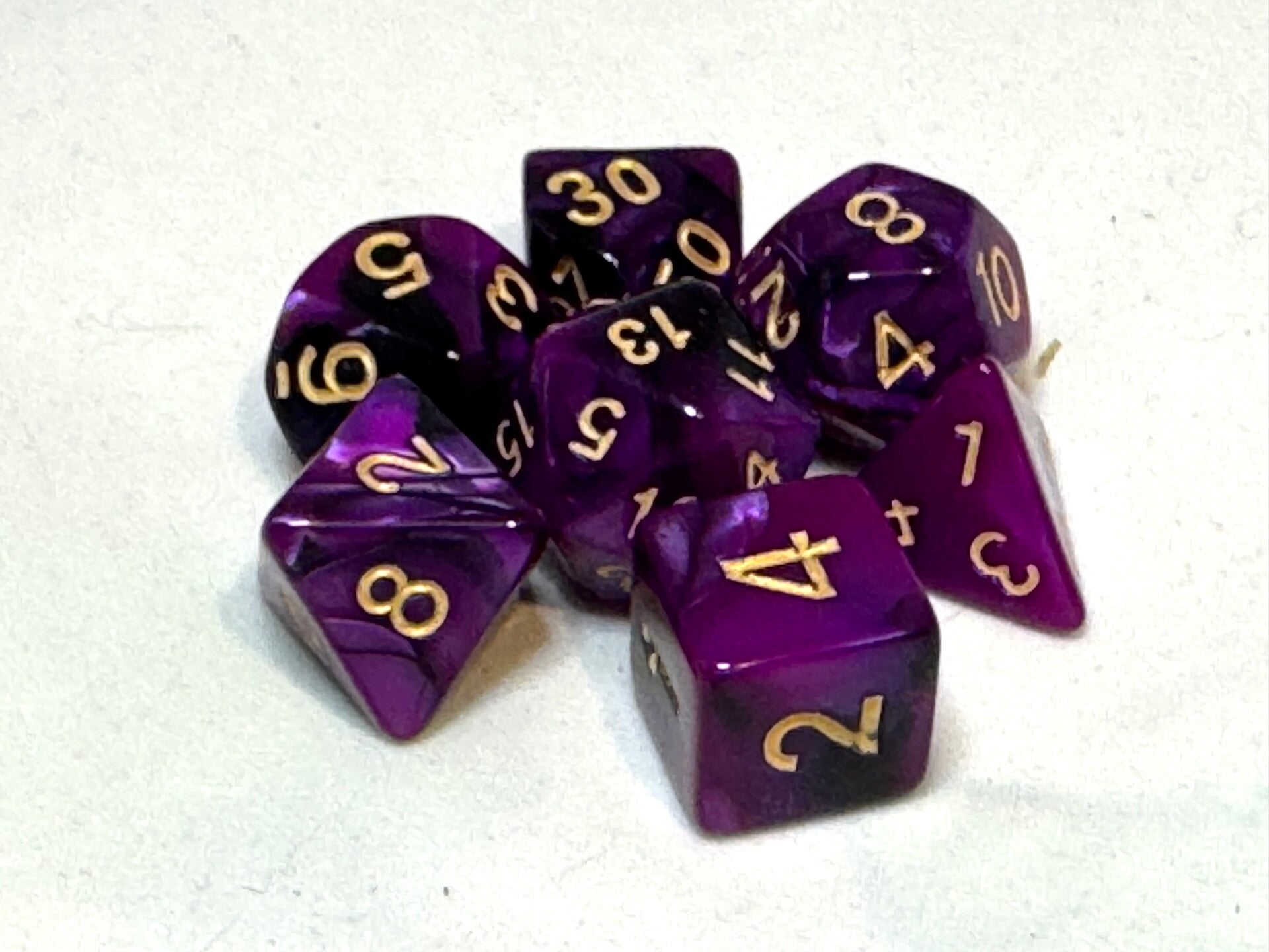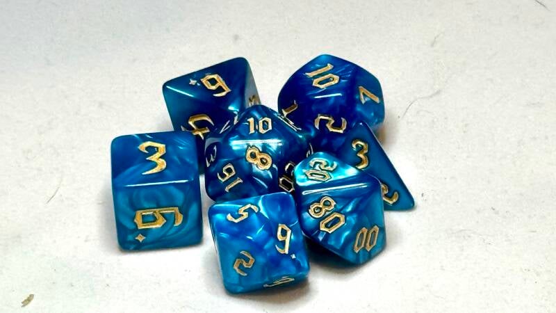 Set composto da sette dadi poliedrici in materiale acrilico con spigoli smussati. Effetto madreperlato, i numeri sono dorati per risaltare meglio.Sono presenti i dadi: D4,D6, D8, D10, D12, D20, D%.