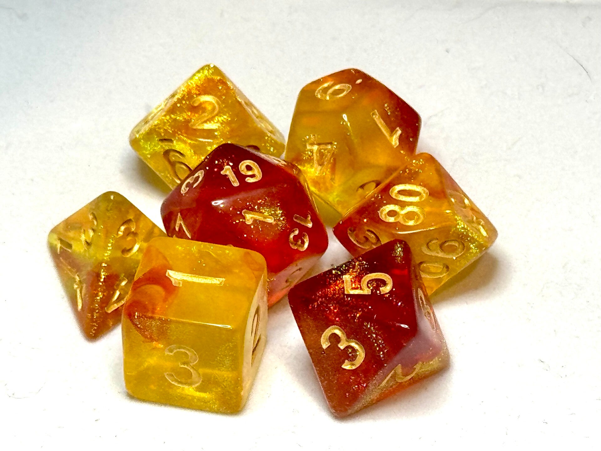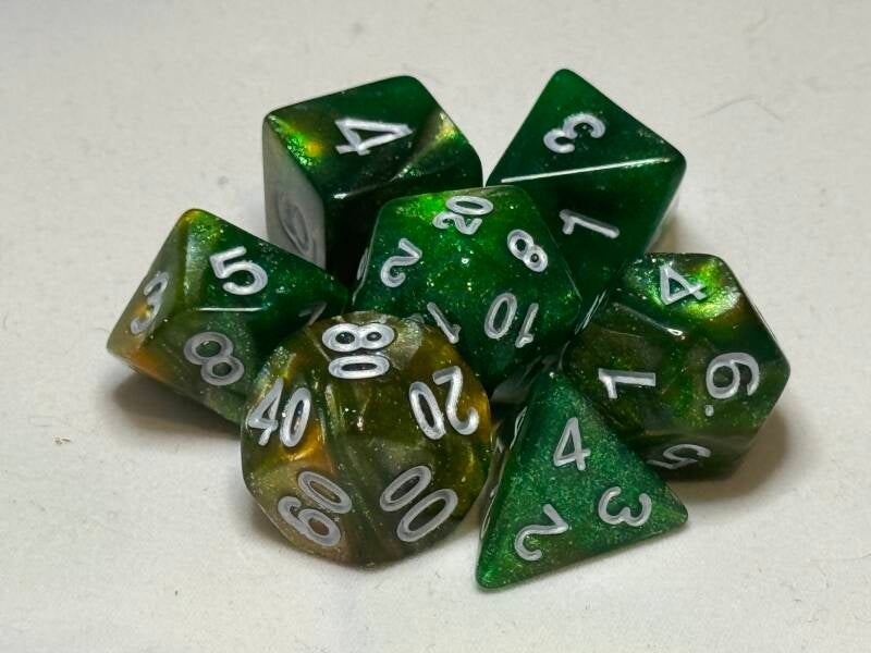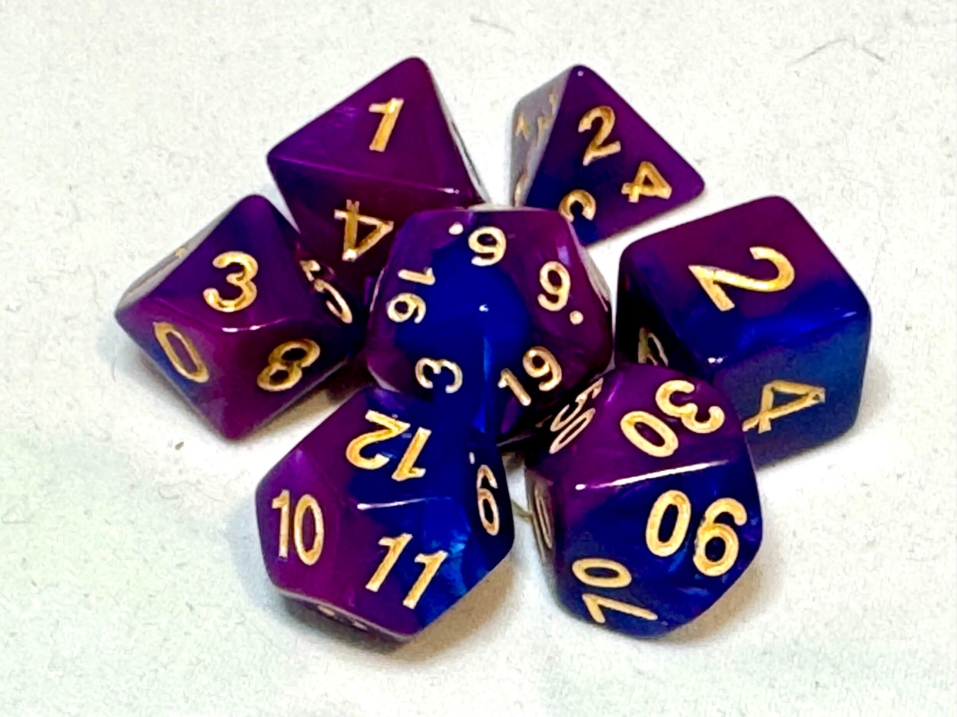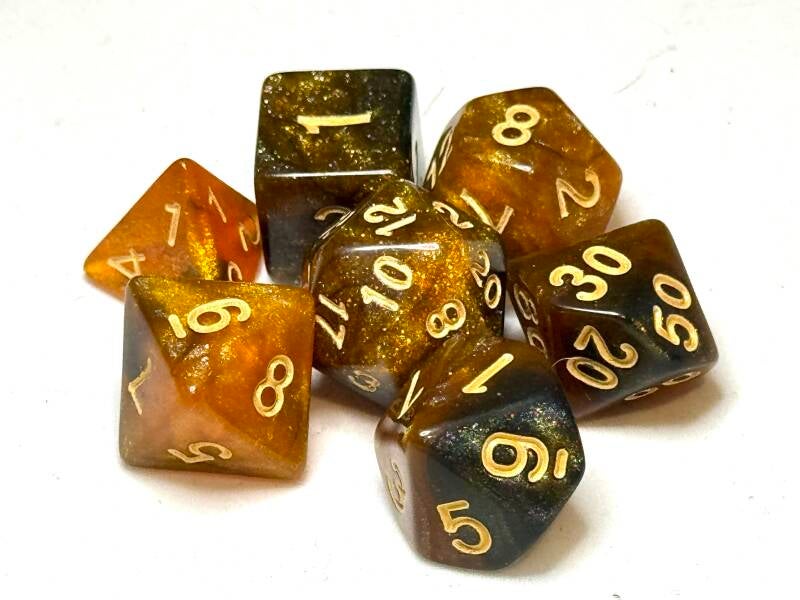 Set composto da sette dadi poliedrici in materiale acrilico con spigoli smussati. Bicolori miscelati, i numeri possiedono una font ad alta leggibilità e sono dorati per risaltare meglio.Sono presenti i dadi: D4,D6, D8, D10, D12, D20, D%.