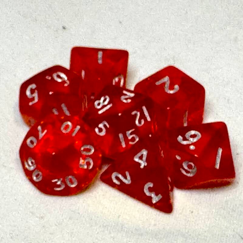 Set composto da sette dadi poliedrici in materiale acrilico con spigoli smussati. I numeri sono rossi' per risaltare meglio.Sono presenti i dadi: D4,D6, D8, D10, D12, D20, D%.