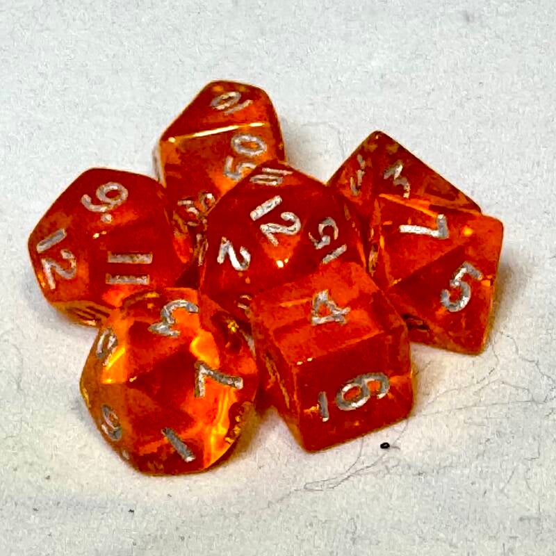 Set composto da sette dadi poliedrici in materiale acrilico con spigoli smussati. Colorazione arancione intenso e decorazioni e numeri in verde acido. Sono presenti i dadi: D4,D6, D8, D10, D12, D20, D%.