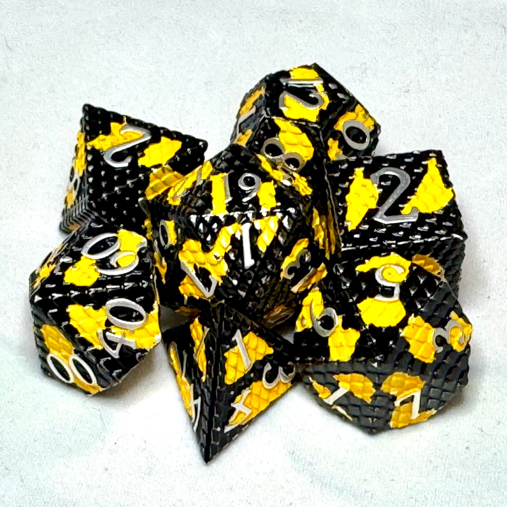 Set composto da sette dadi in metallo, magnifico effetto pelle di serpenteSono presenti i dadi: D4, D6, D8, D10, D12, D20, D%. Prezzo € 65