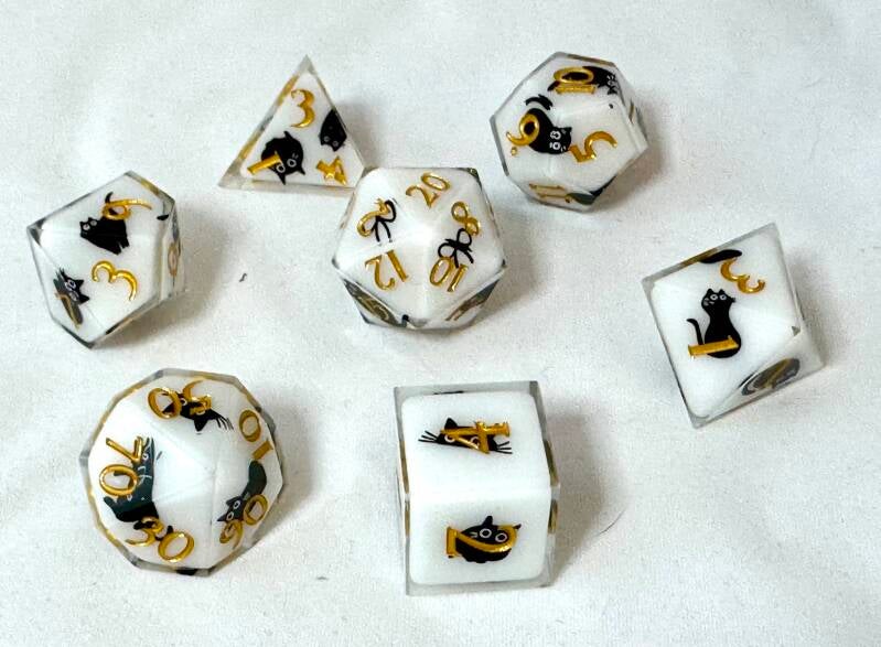 Set completo di sette dadi in resina artigianale , poliedrici, a doppia colata, con spigoli vivi a tema Gatti. Sono presenti i dadi: D4, D6, D8, D10, D12,D20, D%. Prezzo € 42