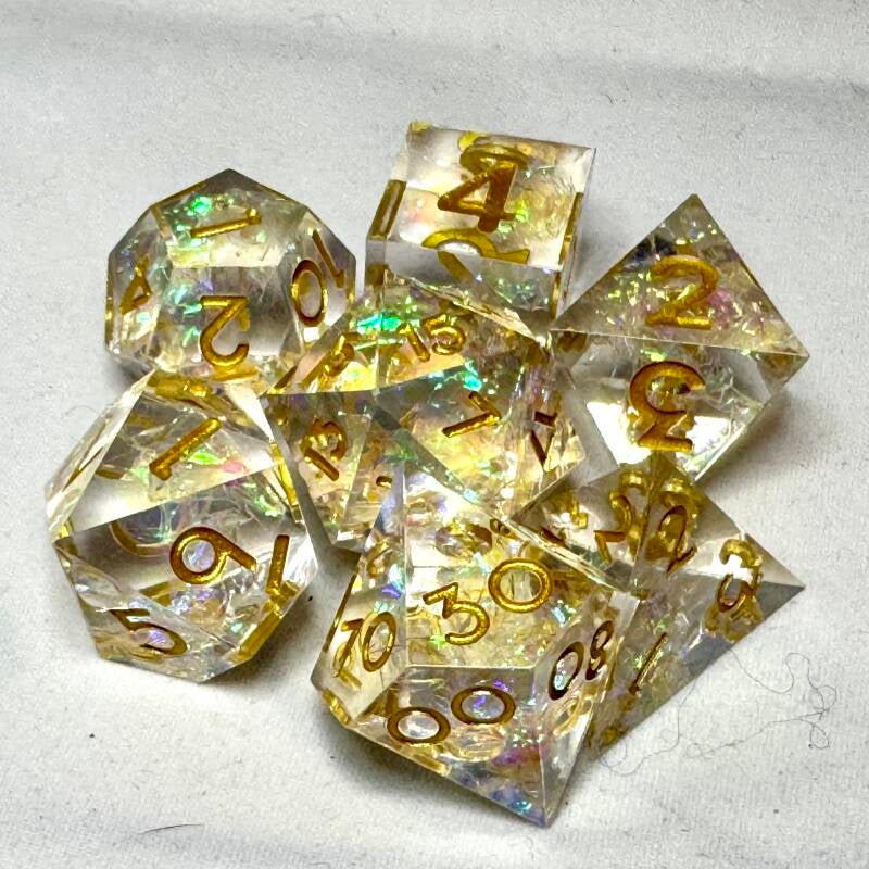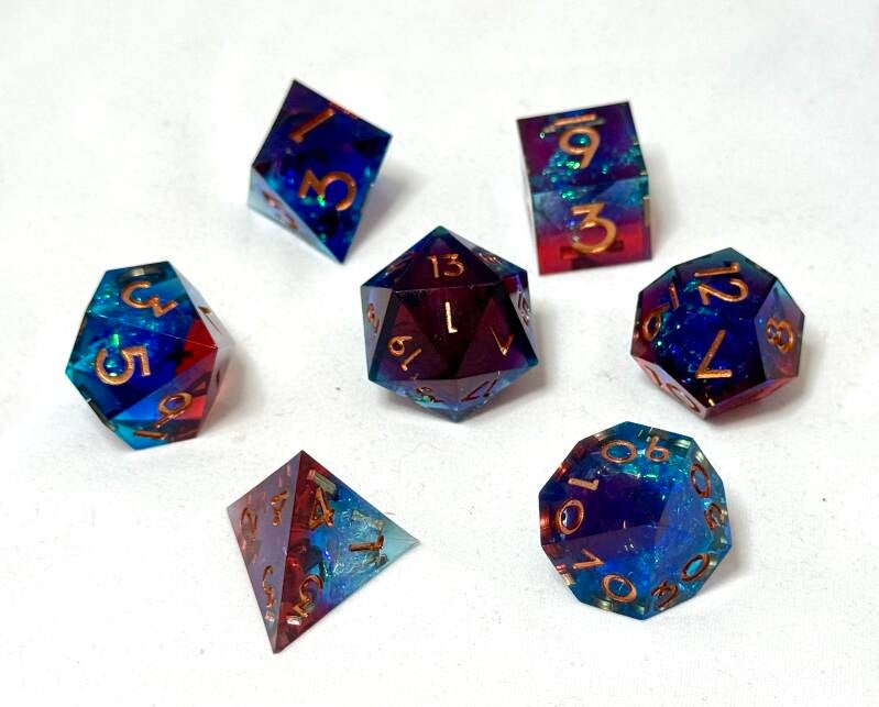 Set composto da sette dadi poliedrici artigianali in resina, con spigoli vivi, un set i cui giochi di trasparenze lo rendono davvero speciale..Sono presenti i dadi: D4,D6,D8,D10, D12, D20, D%.