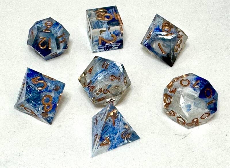 Set completo formato da sette dadi artigianali poliedrici in resina con spigoli vivi. I dadi hanno l’ambizione di voler donare l’effetto dell’acqua all’acqua di mare all’alba. Sono presenti i dadi : D4, D6, D8, D10, D12, D20, D% Prezzo € 35