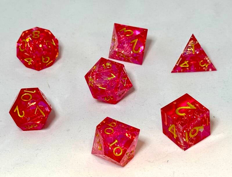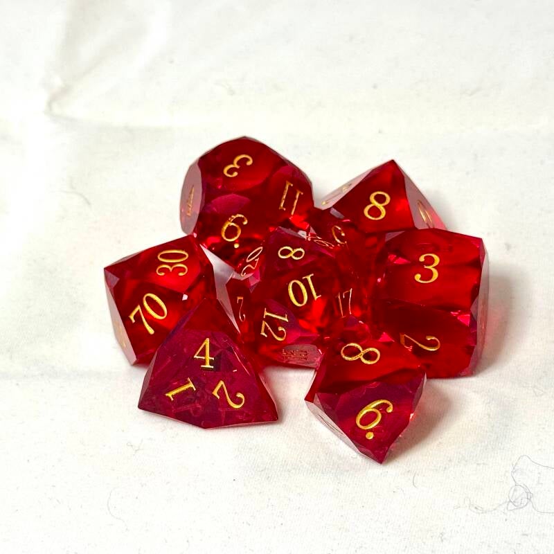 Set composto da sette dadi poliedrici artigianali in resina, dalle mille sfaccettature, un set che si pone l’ambizione di ricordare ed assomigliare ai preziosi rubini. Sono presenti i dadi: D4,D6,D8,D10, D12, D20, D%.