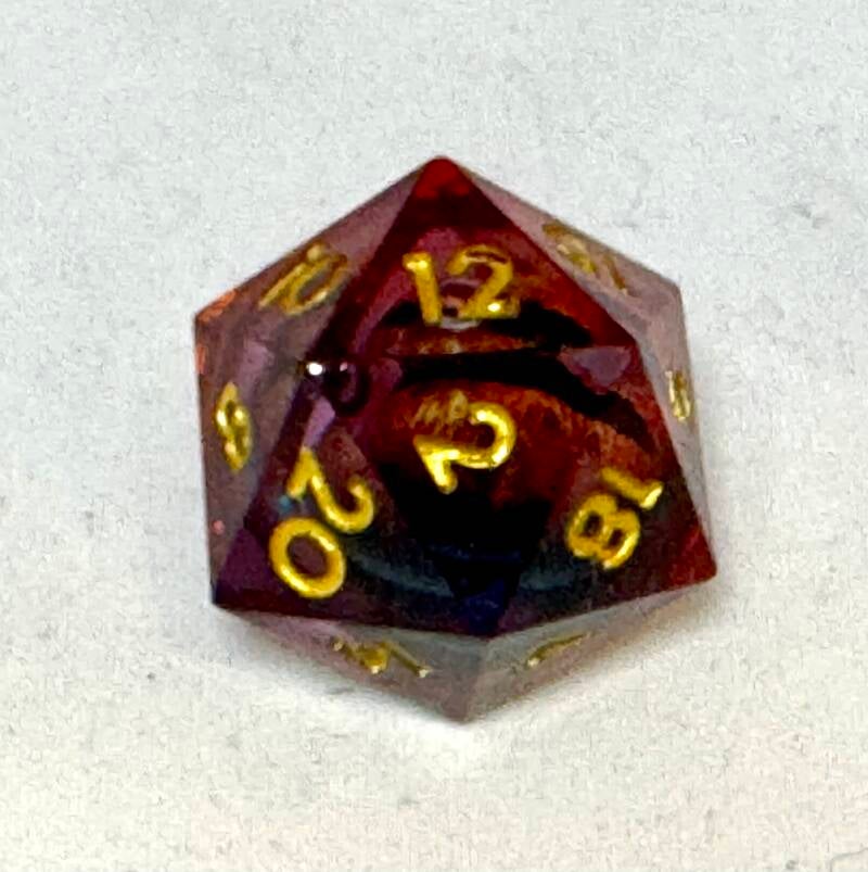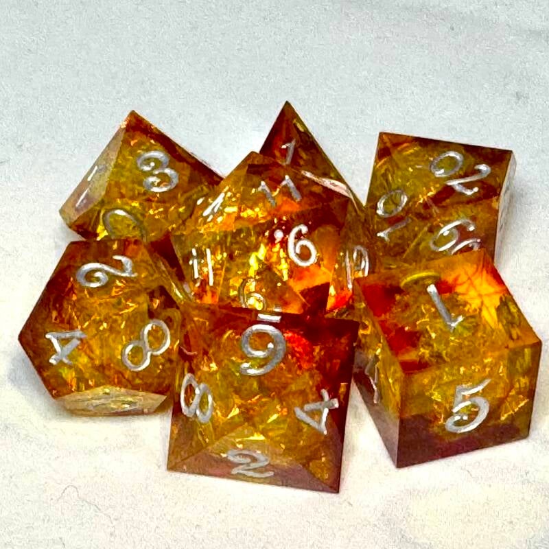 Set composto da sette dadi poliedrici artigianali in resina, con spigoli vivi, un set molto particolare che vuole ricordare il fuoco con i suoi colori e con all’interno delle pagliuzze madreperlate che esaltano le tonalità del rosso.Sono presenti i dadi: D4,D6,D8,D10, D12, D20, D%.