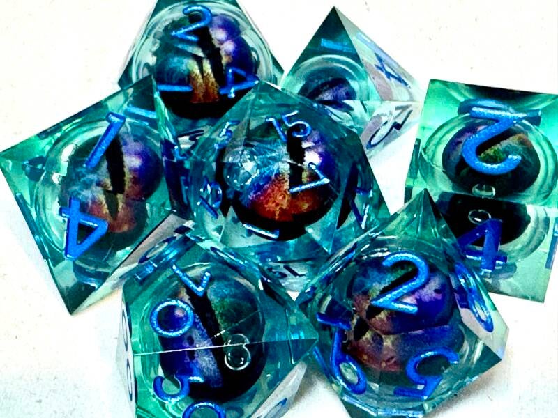 Set composto da sette dadi poliedrici artigianali in resina con spigoli vivi, nel cuore dei dadi vi è una sfera fluttuante con l’occhio di drago nelle tonalità del colore blu. I numeri per ottenere una ottimale leggibilità sono in una font lineare in colorazione Blu. Questo set fa parte di una serie di dadi ispirati al fantastico mondo di Dangeous & Dragons. Sono presenti i dadi: D4,D6, D8, D10, D12, D20, D%.